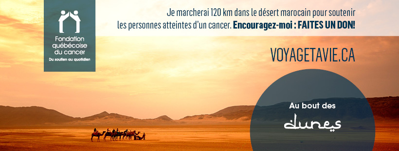Nous mettons à votre disposition une image de couverture Facebook pour informer votre entourage de votre participation au voyage caritatif Au bout des dunes. Il vous sera ainsi plus aisé de solliciter leur générosité! N’oubliez pas également de créer des publications : expliquez pourquoi vous avez choisi de vous impliquer, diffusez des photos de vous pendant que vous vous entraînez en prévision du voyage, faites un décompte avant votre départ, etc.