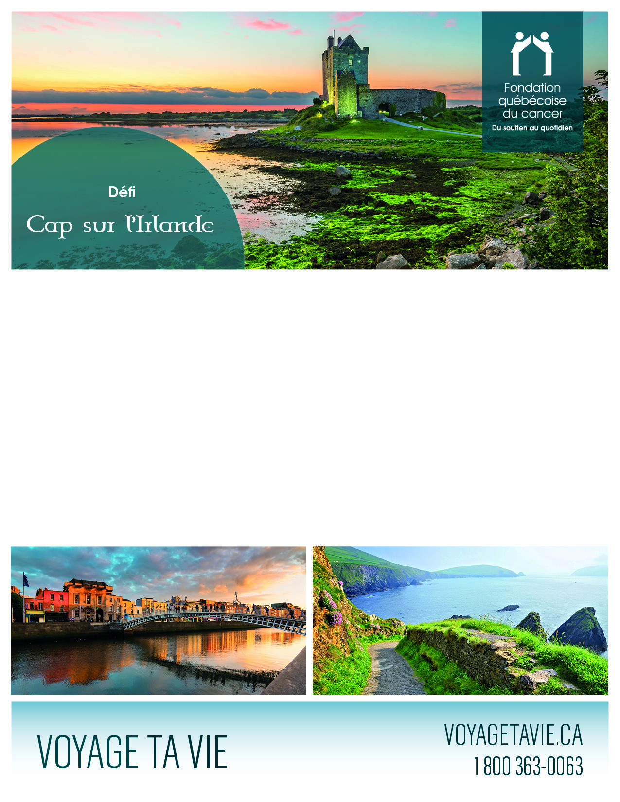 Nous mettons à votre disposition une image de couverture Facebook pour informer votre entourage de votre participation au Défi Cap sur l'Irlande. Il vous sera ainsi plus aisé de solliciter leur générosité! N’oubliez pas également de créer des publications : expliquez pourquoi vous avez choisi de vous impliquer, diffusez des photos de vous pendant que vous vous entraînez en prévision du voyage, faites un décompte avant votre départ, etc.