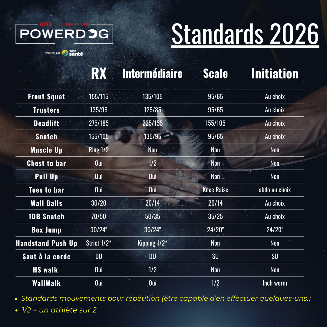 *Pour toutes questions relatives aux standards, veuillez écrire à Marilyne Bonenfant au : info@crossfitstricken.com .